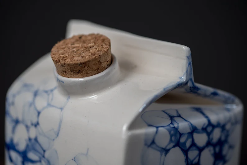 Designer ceramic vase or milk bottle hand painted in white with blue bubbles