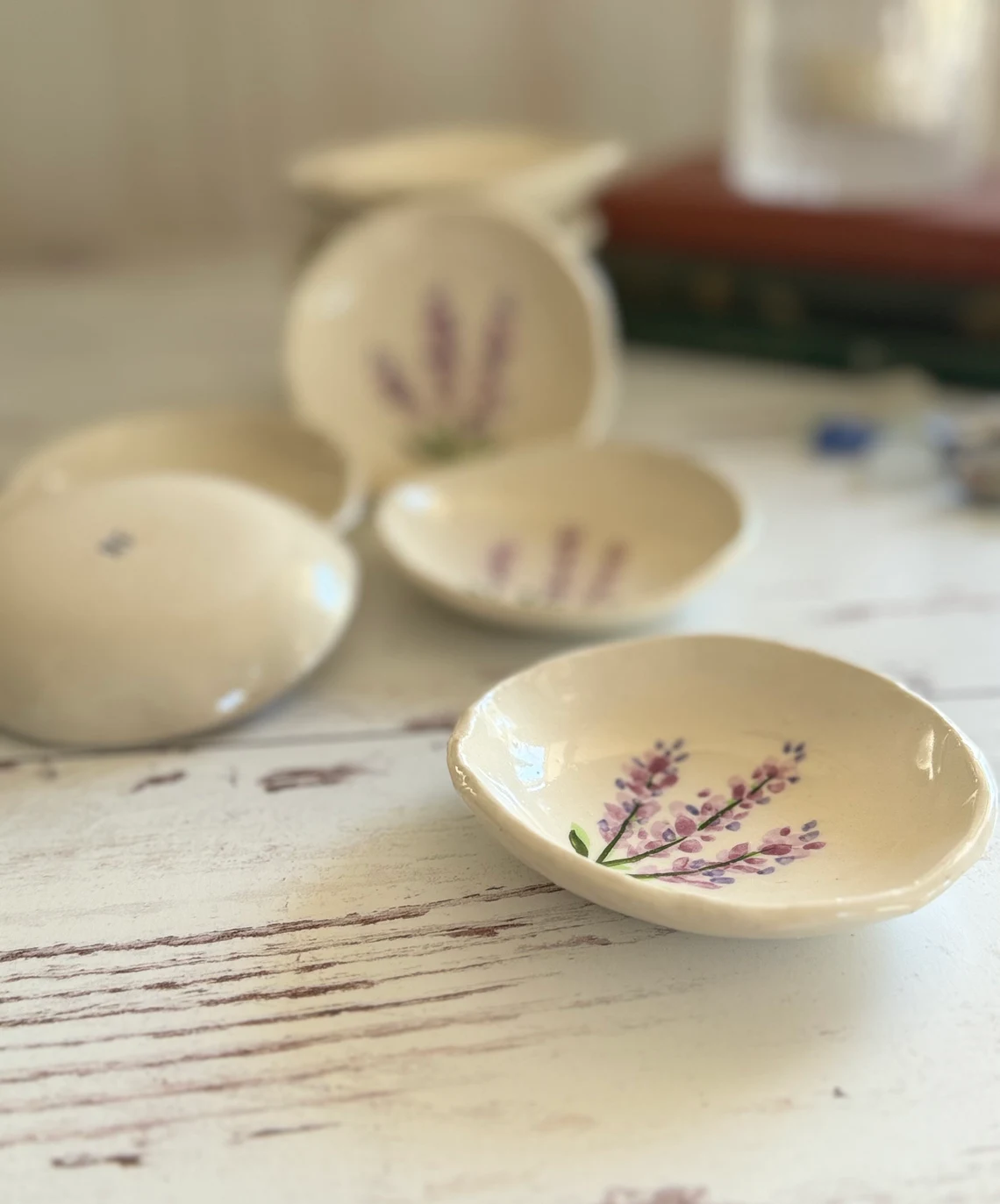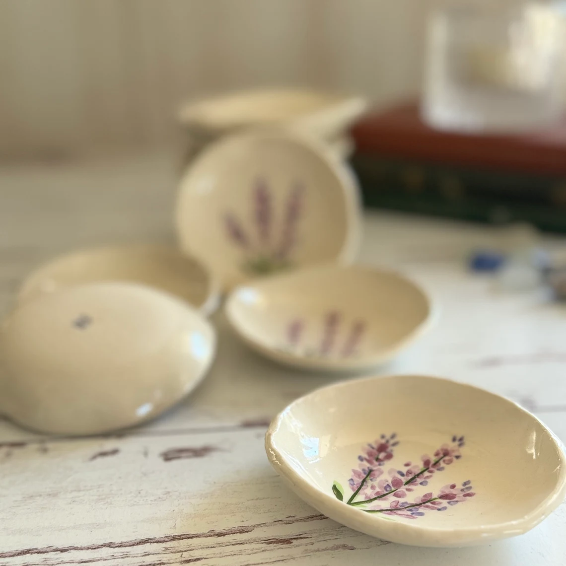 Hand-painted stoneware dipping bowls adorned with lavender stems. Each piece is one-of-a-kind, as they are all individually hand-painted and finished with a clear glaze that highlights both the artwork and the natural texture of the stoneware. Perfect for the bread-lover in your life—pair these charming little bowls with a quality bottle of olive oil. They also make a thoughtful jewelry dish, guaranteed to brighten someone’s day.