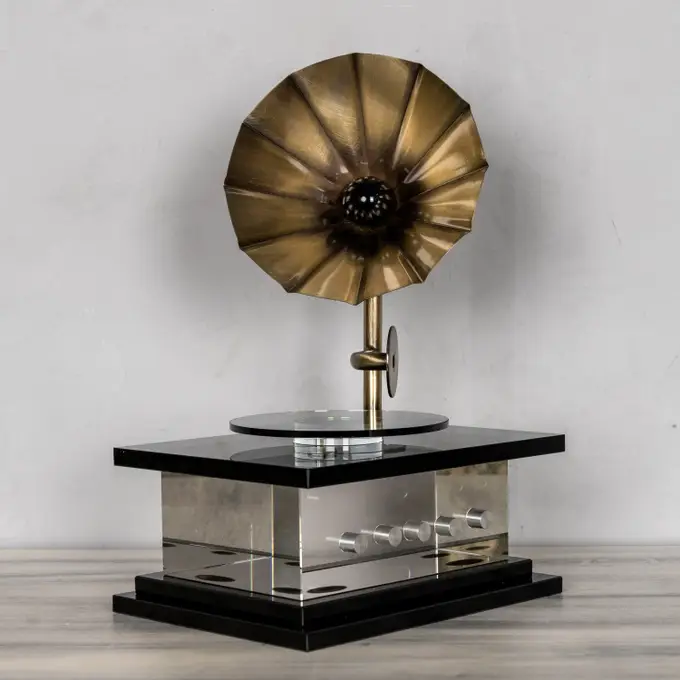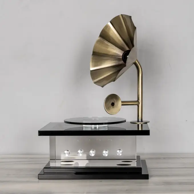 This Gramophone is a stunning, timeless piece of art that effortlessly enhances your living space with unmatched elegance, completing your decor. This refined and sophisticated artifact combines a distinctly modern vibe with a strong vintage flair, thanks to its vibrant color palette. Sold Out Show features a sleek fiberglass body paired with a brass horn, making it as captivating as any other gramophone. Explore more captivating home decor designs here.
