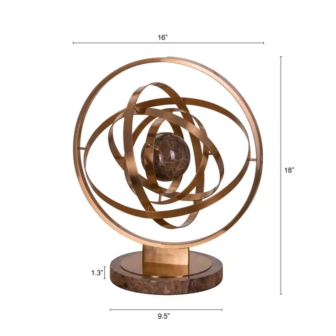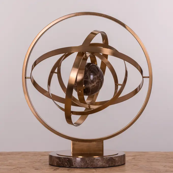 Four interlocking circles rotate gracefully on a marble base, framing a marble center. Our Stratosphere decor piece is a captivating ornament, exuding an elegant charm that will undoubtedly add an exotic touch to your home.